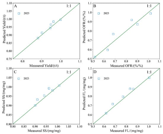 To verify the accuracy and applicability of the comprehensive predictive model, we compared the model’s calculated values with the measured values. As shown in Figure 13, the data points are distributed on both sides of the 1:1 line. Overall, the model effectively predicted the jujube yield, quality, and water consumption under magnetically treated water drip irrigation with microbial organic fertilizer, with R2 ≥ 0.765.