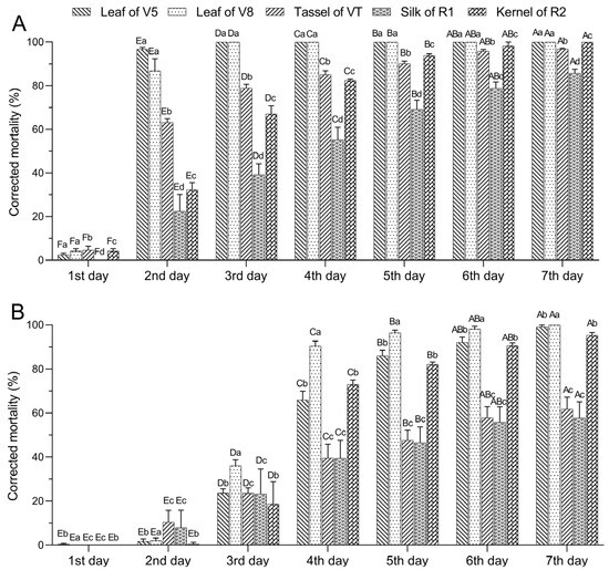 Corrected mortality of Spodoptera exigua neonates (A) and third-instar larvae (B) that fed on different tissues of DBN3601T maize for different durations. Error bars indicate the standard error of the mean. Different lowercase letters indicate significant differences in corrected mortality between different tissues, and different capital letters indicate significant differences in corrected mortality at different survey times (two-way ANOVA, Tukey’s HSD; p < 0.05).