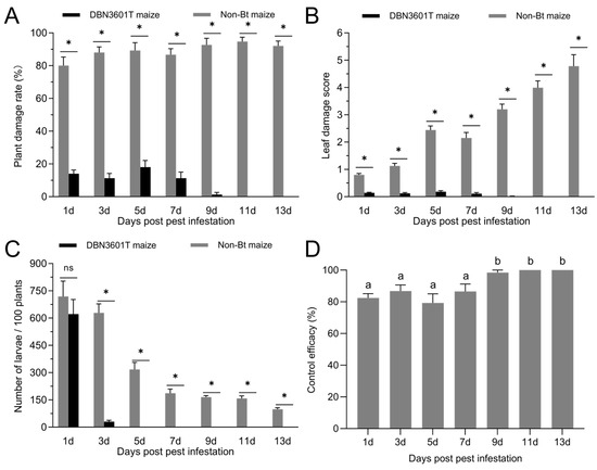 The control effects of DBN3601T maize against Spodoptera exigua in the field trial. (A) The plant damaged rate of Bt and non-Bt maize; (B) the average damage score of maize leaves; (C) the number of larvae per 100 maize plants; (D) the control effect of DBN3601T maize on S. exigua larvae. Error bars indicate the standard errors. Asterisks (*) denote significant differences in the rate of plant damage, leaf damage score, and the number of insects per 100 plants between the two maize varieties on the same days of infestation: * p < 0.05; ns indicates no significant difference (p > 0.05) (Mann–Whitney U test). Different lowercase letters indicate significant differences in the control efficacy of DBN3601T maize across various infestation durations (one-way ANOVA, Tukey’s HSD; p < 0.05).