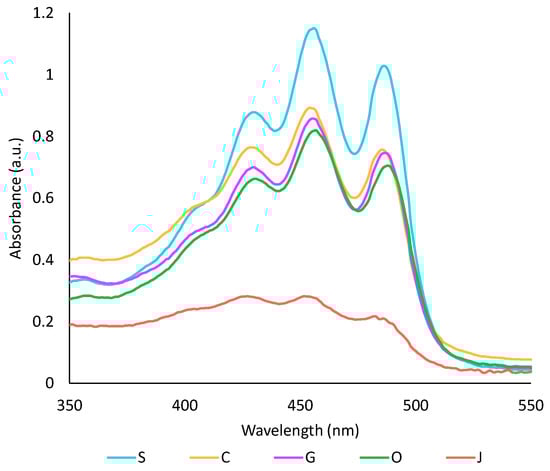Visible spectra of oil phases after a ten-fold dilution in heptane. S: sunflower oil, C: coconut oil, G: grapeseed oil, O: olive oil, J: jojoba oil.
