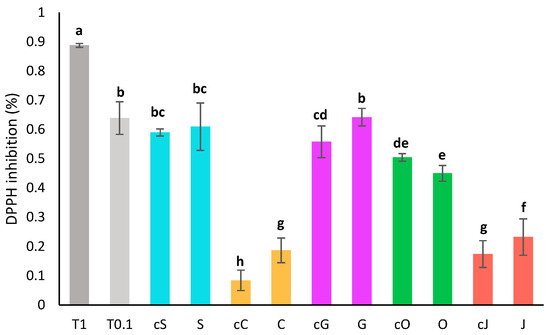 Antioxidant activity by DPPH assay of oil phases diluted twofold compared to the activity of Trolox at 1 mg/mL (T 1) and 0.1 mg/mL (T 0.1). S, C, G, O and J: oil phases obtained respectively with sunflower, coconut, grapeseed, olive and jojoba oil. cS, cC, cG, cO and cJ: corresponding crude oils. Groups a–h are significantly different based on the analysis of variance (p < 0.05).