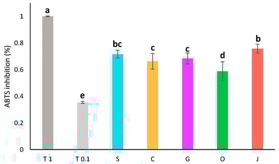 Antioxidant activity by ABTS assay of aqueous phases diluted twofold compared to the activity of trolox at 1 mg/mL (T 1) and 0.1 mg/mL (T 0.1). S: sunflower oil, C: coconut oil, G: grapeseed oil, O: olive oil, J: jojoba oil. Groups a–e are significantly different based on the analysis of variance (p < 0.05).
