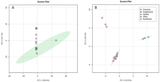 PCA score plots built from (A) the total matrix of the UHPLC-HRMS data, (B) the reduced matrix of the UHPLC-HRMS data. Coconut in yellow, grapeseed in purple, jojoba in red, olive in green and sunflower in blue.