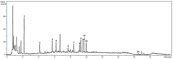 The literature on Bixa orellana focuses mostly on the pigments or volatile content. In the few existing studies on the aqueous extracts of achiote seed, different families of compounds are generally detected without further characterisation [9]. The main compounds from the aqueous phase of the biphasic extract were identified using UHPLC-DAD-HRMS/MS. Compound identification focused on compounds also detected by the DAD (280, 465 nm) (Figure 6). Molecular formulae were proposed with a 5 ppm mass tolerance for MS and 10 ppm for MS/MS. The [M+Na]+ and [M+NH4]+ adduct ions and the comparison of positive and negative ionisation modes were used to corroborate the proposed formulae. The literature and public databases (SciFinder, Pubchem and KNapSack) were queried to suggest a putative identification for each compound. The retention time, m/z, fragmentation characteristics, λmax, proposed molecular formula and proposed identification are summarised in Table 3.