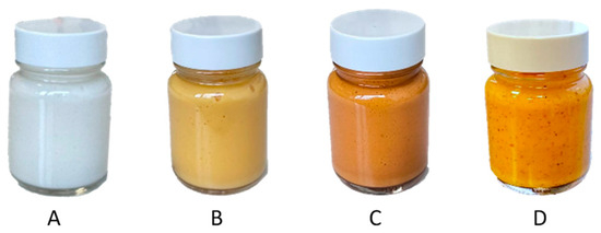 Photograph of the formulations. (A): base formulation, (B): formulation with the extract, (C): formulation with the plant powder, and (D): combined extraction and formulation.