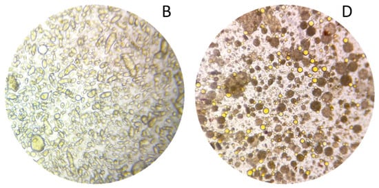 Microscopy at magnification 10× of the formulations (B) and (D).