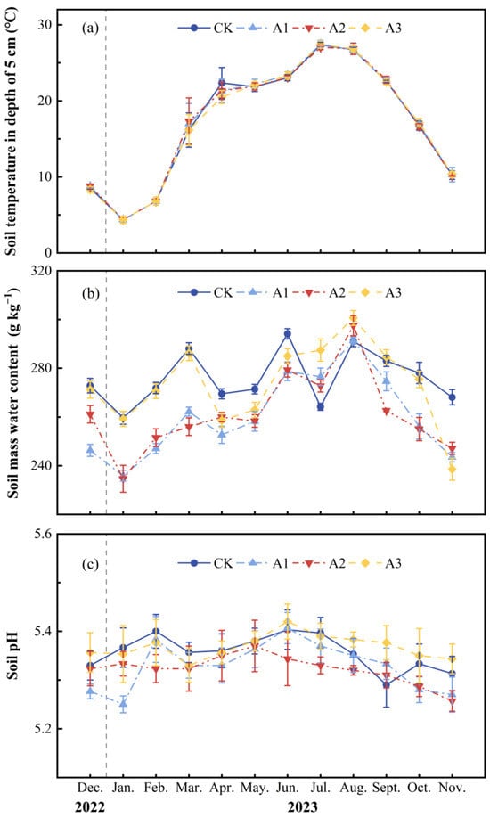 Monthly average ± standard deviation (n = 3) at different fertilizer application rates: (a) soil temperature, (b) soil mass water content, and (c) soil pH. The deviations are indicated by error bars.