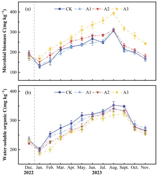 Monthly average ± standard deviation (n = 3) at different fertilizer application rates, including (a) soil microbial biomass carbon and (b) soil water-soluble organic carbon. The deviations are indicated by error bars.