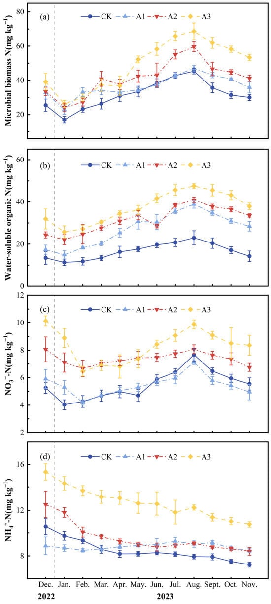 Monthly mean ± standard deviation (n = 3) at different fertilizer application rates for (a) soil microbial nitrogen, (b) soil water-soluble organic nitrogen, (c) soil nitrate nitrogen, and (d) soil ammonium nitrogen. The deviations are indicated by error bars.