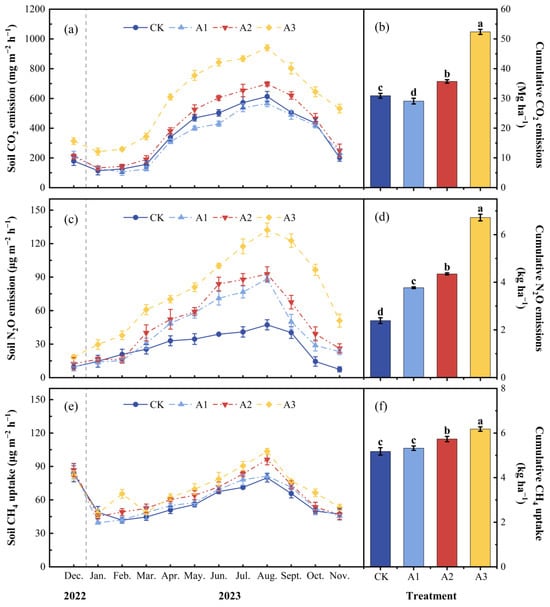 Monthly mean ± standard deviation (n = 3) under different fertilization rates: (a) soil CO2 emission flux, (c) soil N2O emission flux, (e) soil CH4 uptake flux, (b) soil cumulative CO2 emissions, (d) soil cumulative N2O emissions, and (f) soil cumulative CH4 uptake. The deviations are represented by error bars, and distinct lowercase letters represent significant variations among different treatments (p < 0.001).