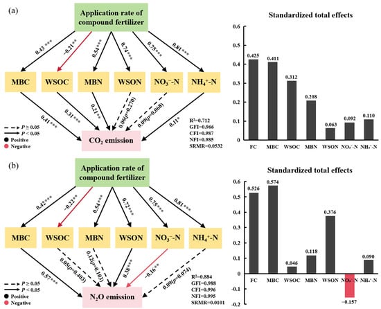 N2O exhibits a global warming potential 300 times that of CO2 [31]. In this study, compound fertilizer intervention significantly increased soil N2O emission flux throughout the entire experimental period, which is in conformity with previous research findings [32]. Structural equation modeling and stepwise regression analysis showed that changes in soil labile carbon, nitrogen pools, and environmental factors directly or indirectly affect soil N2O emissions (Table 3, Figure 5b). Soil N2O emissions are primarily affected by nitrification (aerobic process) and denitrification (anaerobic process) [33,34]. Hydrothermal conditions and soil physical and chemical properties have an important impact on the production of N2O by microorganisms [35]. Specifically, compound fertilizers are high in nitrogen. Therefore, adding more compound fertilizers to the soil may increase the amount of nitrogen present, resulting in stimulating the metabolic activity and reproduction of microorganisms, which may enhance the rates of soil nitrification and denitrification, thus promoting soil N2O emissions. Another reason may be changes in labile nitrogen pools in the soil. After utilizing compound fertilizer, the concentrations of NO3−-N and NH4+-N in the soil significantly rise, which acts as a substrate source for microbial nitrification and denitrification [36], thus promoting nitrification and denitrification of the soil and causing soil’s emissions of N2O to rise (Figure 3c,d and Figure 4c,d). Additionally, the rise in MBC and MBN concentrations in the soil promotes the increase in the number of microorganisms, thereby promoting N2O emissions from the soil (Figure 2a, Figure 3a and Figure 4c,d).