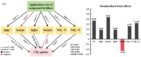 Under the CK, A1, A2, and A3 treatments, which correspond to compound fertilizer application rates of 0, 400, 800, and 1600 kg ha−1, respectively, a stepwise regression analysis model was conducted to investigate a link between soil CH4 absorption flux and mass water content (M, g kg−1), soil water-soluble organic carbon and nitrogen (WSOC, WSON, mg kg−1), soil microbial biomass carbon (MBC, mg kg−1), as well as soil nitrate nitrogen and ammonium nitrogen (NO3−-N, NH4+-N, mg kg−1). Standardized coefficients were used as the model’s coefficients. The degree of freedom was 36; *** indicates p < 0.001.