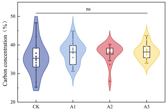The violin box plot describes the carbon content distribution of 15 Polygonatum cyrtonema Hua samples in each treatment in the form of a curve. The horizontal line inside the box denotes the mean value, the upper and lower lines of the box plot indicate the data’s maximum and minimum values, and the upper and lower bounds of the box signify the upper and lower quartiles of data. The acronym “ns” means there are no appreciable differences among the four treatments (p > 0.05).
