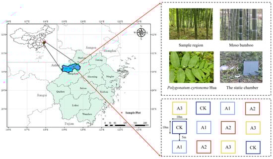 In November 2020, pure Moso bamboo forest sample plots with nearly identical growth and site conditions were selected. We planted Polygonatum cyrtonema Hua seedlings in these sampling plots to transform the pure Moso bamboo forest into an agroforestry management model. The plant spacing of the Polygonatum cyrtonema seedlings was 20 cm × 20 cm. A random block design was adopted, with 4 treatments and 3 repetitions per treatment, and a total of 12 test plots were planted, each with an area of 10 m × 10 m. To prevent interference from Moso bamboo underground roots on adjacent plots, a 5 m isolation zone was established between each trial plot. Winter is an important season for the root growth of Polygonatum cyrtonema Hua; therefore, in the third year of the agroforestry management model (November 2022), we applied compound fertilizer (mainly composed of N, P, and K compounds: N, 15%; P2O5, 15%; and K2O, 15%) and spread it evenly on the sample plot. The treatments were as follows: (1) control group, no compound fertilizer (CK) was applied; (2) application of 400 kg ha−1 of compound fertilizer (A1); (3) application of 800 kg ha−1 of compound fertilizer (A2); and (4) application of 1600 kg ha−1 of compound fertilizer (A3). In November 2022, the sample plots were weeded. Following that, a stationary box was positioned at the diagonal junction of every trial area for GHG collection for an extended period of time. Sampling and analysis began one month after fertilization and the frequency of GHG collection and soil sample collection was once a month. The trial lasted for 12 consecutive months (December 2022 to November 2023).