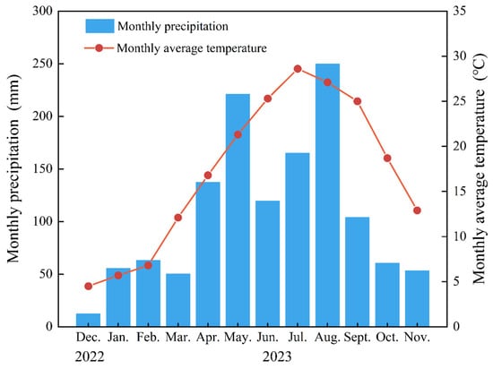Sui Mei Forestry Field, Lin’an District, Zhejiang Province, China is the location of the survey region (119°84′ E, 30°23′ N) (Figure 7). It features a terrain characterized by low mountains and hills, with an altitude of approximately 85 m and a slope of approximately 25°. This area enjoys the typical warm, humid subtropical monsoon climate, with plenty of sunshine and precipitation. Annual average precipitation ranges between 1250 and 1500 mm, with a yearly mean temperature of 17.1 °C, 158 precipitation days, and a yearly average frost-free period of 237 days. The soil in the survey region is classified as Ferralsols according to the 2014 FAO soil classification system [47]. The average monthly temperature and precipitation during the experimental period are displayed in Figure 8.