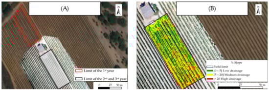 (A) Orthophotomap of the 1st year (outlined with a red line) and 2nd and 3rd year (outlined with a black line) (B) digital map of slopes of the vineyard of Vitis vinifera cv. Syrah grapes.