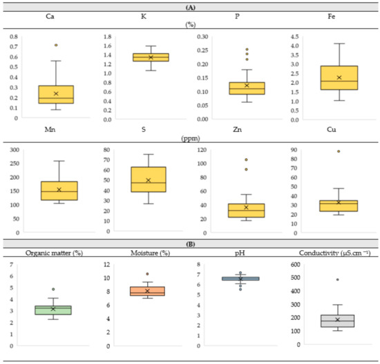 Soil sampling (n = 28) was performed from the surface of the soil to a 30 cm depth (ca. 100 g), and then the samples were sieved (2.0 mm mesh to remove stones, coarse materials, and other debris), dried under 105 °C for 24 h, and subjected to 1 h of desiccation (until room temperature). Samples were then weighed to determine the dry mass and percentage of moisture. To determine the organic matter, the samples were heated to 550 °C for 4 h (i.e., until a constant weight), removed from the muffle at 100 °C, and then weighed (after desiccation until they reached room temperature for 1 h). Electrical conductivity and pH data were acquired by using a potentiometer, as described by [63]. Mineral quantification of the samples was carried out with an XRF analyzer (model XL3t 950 He GOLDD+, Niton Thermal Scientific, Munich, Germany) under a helium atmosphere, according to [64].