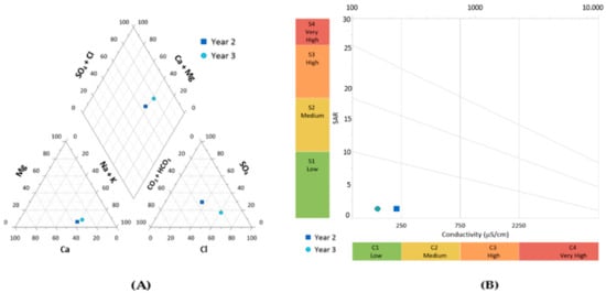 Physicochemical characterization of irrigation water in the vineyard of Syrah during the 2nd and 3rd years of the experimental period. Projection of water sample with (A) a ternary Piper diagram; (B) a Wilcox diagram.