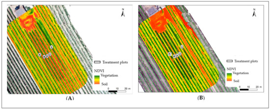 To monitor the general physiological response of the vines to Zn enrichment, following agronomic practices in the vineyards, NDVI images were acquired during the experimental work period of the last two years (after the 4th and 1st foliar applications, respectively). Data were processed with an ArcGIS Pro [62].