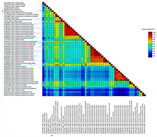 - Lyu, J.; Yang, Y.; Sun, X.; Jiang, S.; Hong, H.; Zhu, X.; Liu, Y. Genetic variability and molecular evolution of tomato mosaic virus populations in three northern China Provinces. Viruses 2023, 15, 1617. [Google Scholar] [CrossRef] [PubMed]