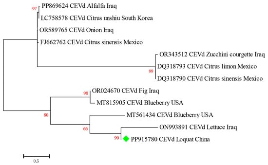 He, C.; Wang, L.; Li, Y.; Zhou, K.; Zhao, K.; Chen, D.; Li, J.; Song, H.; Tu, M. Loquat (Eriobotrya japonica) Is a New Natural Host of Tomato Mosaic Virus and Citrus Exocortis Viroid. Plants 2024, 13, 1965. https://doi.org/10.3390/plants13141965