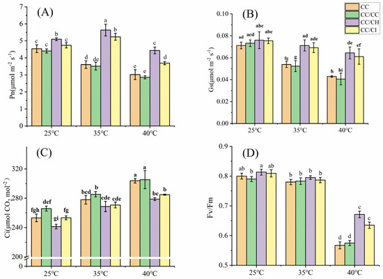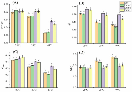 Photosynthetic apparatuses such as PSI and PSII, the cytochrome b6f (Cytb6f) complex, and Rubisco can be directly harmed by HS [47]. Additionally, the inactivation of these photosynthetic apparatuses under high temperatures can inhibit various redox and metabolic reactions and disrupts photosynthetic electron transfer [41,48]. In addition, excessive light energy leads to photoinhibition and subsequent production of reactive oxygen species. Fv/Fm is a good indicator of the degree of the photosynthesis photoinhibition [49]. The decrease in Fv/Fm in CC/CH and CC/CI was smaller under HS (Figure 1D), indicating that the degree of photosynthesis photoinhibition in CC/CH and CC/CI was lower than that in CC and CC/CC. In this study, qP, Fv’/Fm’ and ΦPSII showed a decreasing trend (Figure 2A–C), indicating that HS restricted the photosynthetic electron transport of plants, resulting in the hindered synthesis of ATP and NADPH, and in a decrease in the assimilation of CO2 in carbon reaction. The qP, Fv’/Fm’, ΦPSII and NPQ of CC/CH and CC/CI showed a more stable performance, indicating that CC/CH and CC/CI could maintain a higher number of open PSII reaction centers and efficiency of light energy transformation by PSII, less heat dissipation, and linear electron transport rate than CC and CC/CC. From our results, the photosynthesis system of CC/CH and CC/CI exhibited better heat resistance under HS.