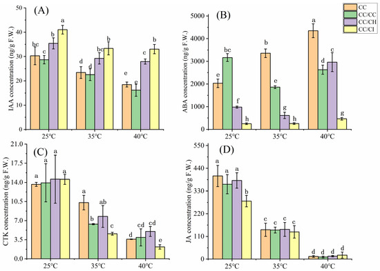 The IAA, CTK, and JA contents exhibited a declining trend under HS conditions at both 35 °C and 40 °C. At 35 °C, the IAA content in CC, CC/CC, CC/CH, and CC/CI decreased by 22.7%, 21.4%, 17.5%, and 18.7%, respectively, whereas at 40 °C, the IAA content decreased by 38.9%, 43.7%, 21.1%, and 19.4% in CC, CC/CC, CC/CH, and CC/CI, respectively (Figure 3A). Obviously, there was a significantly greater reduction in IAA levels observed in the CC and CC/CC groups compared to the CC/CH and CC/CI groups following heat treatment at 40 °C, as opposed to 25 °C. In terms of CTKs, the concentrations exhibited a decline of over 60% across all four Chinese hickory groups at 40 °C, while these decreased only in CC and CC/CH at 35 °C (Figure 3C). Notably, among these groups, the CTK content of CC/CH was the highest among the four groups, which also showed the smallest decrease in CTK content at 40 °C compared to 25 °C. The decrease in JA was more pronounced at 35 °C compared to IAA and CTKs, with a sharp decline of over 90% observed at 40 °C. At 40 °C, the ABA levels exhibited an increase in all the Chinese hickory groups except in CC/CC (Figure 3B). However, at 35 °C, the ABA contents decreased in CC/CC, CC/CH and CC/CI but increased in CC. Furthermore, the ABA increase was greater in CC/CH and CC/CI at 40°C when compared to the control temperature of 25 °C.
