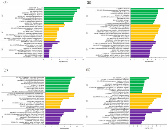 The top 10 enriched GO terms in four comparisons at 40 °C. BP: biological process; CC: component category; MF: molecular function. Numbers 25, 40 indicate grafted plants treated at 25 °C and 40 °C for 4 days, respectively. CC: non-grafted Carya cathayensis, CC/CC: self-grafted Carya cathayensis, CC/CH: Carya cathayensis grafted onto Carya hunanensis. CC/CI: Carya cathayensis grafted onto Carya illinoinensis. (A): 40-CC vs. 25-CC, (B): 40-CC/CC vs. 25-CC/CC, (C): 40-CC/CI vs. 25-CC/CI, (D): 40-CC/CH vs. 25-CC/CH. The default parameters for screening genes with differential expression with a p-value < 0.05 and a fold difference greater than 2.