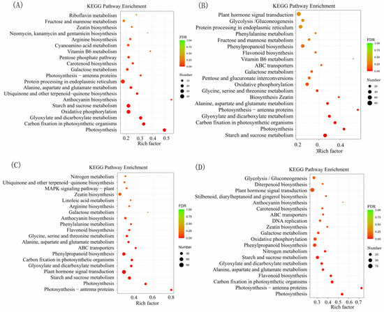 The top 20 enriched KEGG pathways in four comparisons of grafted Carya cathayensis exposure 40 °C treatments. (A): 40-CC vs. 25-CC, (B): 40-CC/CC vs. 25-CC/CC, (C): 40-CC/CH vs. 25-CC/CH, (D): 40-CC/CI vs. 25-CC/CI; Numbers 25 and 40 indicate grafted plants treated at 25 °C and 40 °C for 4 days, respectively. CC: non-grafted Carya cathayensis, CC/CC: self-grafted Carya cathayensis, CC/CH: Carya cathayensis grafted onto Carya hunanensis. CC/CI: Carya cathayensis grafted onto Carya illinoinensis. The default parameters for screening genes with differential expression with a p-value < 0.05 and a fold difference greater than 2.