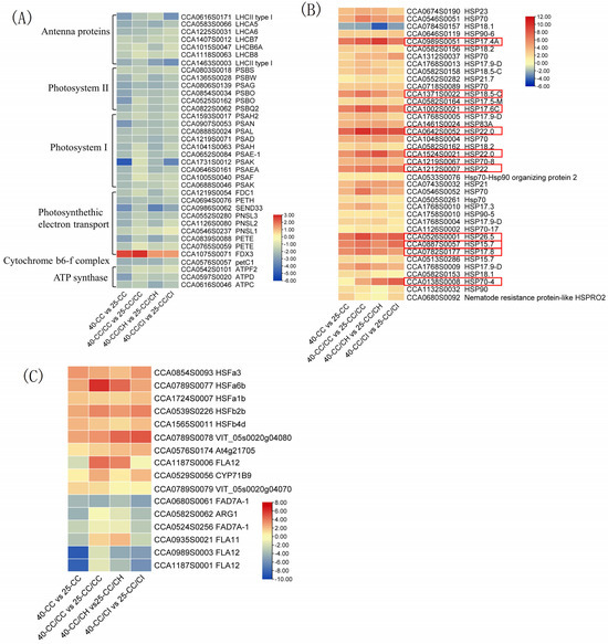 Heat map of DEGs related to HSR in the four grafted Carya cathayensis comparisons following exposure to 40 °C treatments. Numbers 25 and 40 indicate grafted plants treated with 25 °C and 40 °C for 4 days, respectively. CC: non-grafted Carya cathayensis, CC/CC: self-grafted Carya cathayensis, CC/CH: Carya cathayensis grafted onto Carya hunanensis. CC/CI: Carya cathayensis grafted onto Carya illinoinensis. The numbers on the different colored bars are log2|fold-change|values. (A): Heat map of DEGs related to photosynthesis in the four comparisons. (B): Heat map of DEGs related to HSPs in the four comparisons. (C): Heat map of DEGs related to HSF in the four comparisons. Genes in red box in Figure 6B were the genes with log2|fold-change| > 5 in more than two of the four comparations.