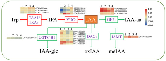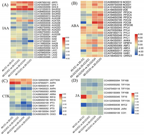We identified 65 DEGs associated with the “plant hormone signal transduction” pathway, which exhibited enrichment in various phytohormone signal transduction clades, including IAA, ABA, CTKs, and JA. The most significantly enriched signal pathways were IAA, ABA, and CTK, with 28, 18, and 13 DEGs annotated to them, respectively. Among the DEGs associated with IAA, eight AUX (AUXIN) genes were found to be downregulated compared to 25 °C, and their expression levels were lower at 40 °C than at 35 °C. In contrast, genes of small auxin upregulated RNA (SAUR32; CCA1212S0015), indole-3-acetic acid-amido synthetase 3.9 (GH3.9; CCA0923S0058), and auxin response factor 5 (ARF5, CCA0679S0102) were found to be significantly upregulated. In addition, we identified 20 genes related to IAA synthesis and metabolism, and 4 ABA synthesizing genes (Figure 7B and Figure 8).