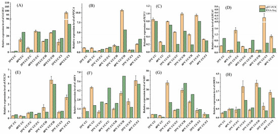 To validate the accuracy of the RNA-seq data, we selected a total of eight genes for further quantitative RT-PCR (qRT-PCR) analysis. Overall, the expression patterns observed via qRT-PCR for these eight genes were consistent with the RNA-Seq data (Figure 9), indicating a high level of reliability in the transcriptome data.