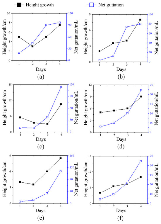 Figure 1. Relationship between guttation volume and the height growth of Ph. edulis ‘Pachyloen’ bamboo shoots. (a) The first shoot; (b) the second shoot; (c) the third shoot; (d) the fourth shoot; (e) the fifth shoot; (f) the sixth shoot.