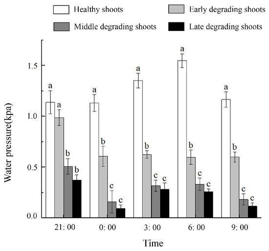 Figure 2. Dynamic change in water pressure at different times in healthy shoots and degrading shoots of Ph. edulis ‘Pachyloen’. Different letters in each graph indicate significant differences, p < 0.05.