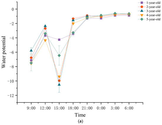 The water potential of culms exhibited significant variations across different ages. In general, the water potential of parent culms decreased upon the emergence of bamboo shoots, as depicted in Figure 3. However, during the period of 3:00–6:00, the water potential during the exuberant stage of shoot emergence surpassed that of the early stage. Furthermore, during the final stage of shoot emergence, the water potential reached its lowest point. During a specific time period, the water potential fluctuations in parent culms at various stages of growth exhibited a consistent pattern, characterized by a “double valley” curve during the initial phase of shoot emergence and a “single valley” curve during the subsequent stages of shoot emergence. Furthermore, the water potential of parent culms, regardless of age, reached its peak between the hours of 3:00 and 6:00, while it reached its lowest point between 9:00 and 12:00. Comparing the water potentials of parent culms at different ages, it was found that at the early stage of shoot emergence, the water potentials of 2-year-old and 3-year-old culms were the highest from 9:00 to 21:00, except 15:00. Conversely, the water potentials of 5-year-old culms reached their peak between 0:00 and 3:00. At the later stage of shoot emergence, the water potential of culms aged 4 or 5 years exhibited the highest values between 9:00 and 18:00, while the water potential of culms aged 2 or 3 years was comparatively higher during other time periods. During the final phase of shoot emergence, it was observed that the water potential of 1-year-old bamboo reached its peak between 21:00 and 3:00, while the water potential of 4-year-old and 5-year-old culms exhibited higher levels during the remaining time periods.