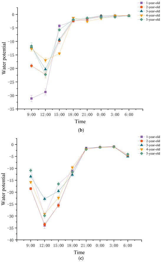 Figure 3. Daily changes in water potential of Ph. edulis ‘Pachyloen’ culms at different ages in different stages of bamboo shoot emergence. (a) In the early stage of shoot emergence; (b) in the exuberant stage of shoot emergence; (c) in the last stage of shoot emergence.