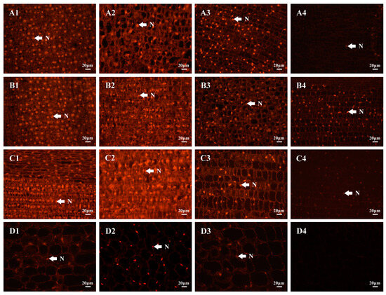Figure 4. Nucleus fluorescence in healthy shoots and degrading shoots at different developmental stages. (A1D1) Healthy bamboo shoots; (A2D2) early degrading shoots; (A3D3) middle degrading shoots; (A4D4) late degrading shoots; (A1A4) meristematic stage; (B1B4) initial elongation stage; (C1C4) rapid elongation stage; (D1D4) late elongation stage. N: Nucleus.