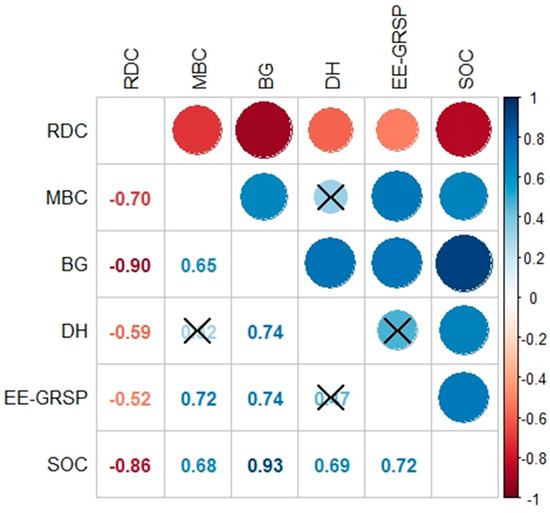 Correlation matrix with the plotted significance test. Negative and positive correlations are shown as red and blue circles, respectively. Size and color intensity of the circles are proportional to the correlation coefficients. The values of the correlation coefficients are shown in the color intensity bar. Crosses were added to correlations that were not considered significant at the 0.95 confidence level. RDC: readily dispersible clay [NTU/(g L−1)]; MBC: microbial biomass carbon (mg g−1); BG: β-glucosidase (mg PNF kg−1 soil h−1); DH: dehydrogenase (µg TPF g−1 soil 24 h−1); EE-GRSP: easily extractable glomalin-related soil protein (mg g−1); SOC: soil organic carbon (g kg−1).