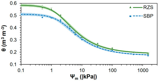 Soil water retention curves (SWRCs) for aggregates from the rhizosphere soil (RZS) and aggregates from the soil between plant rows (SBP). Points represent the mean of the observed data ± standard error, lines correspond to the fitted data, and shadows represent a 95% confidence interval, n = 3.