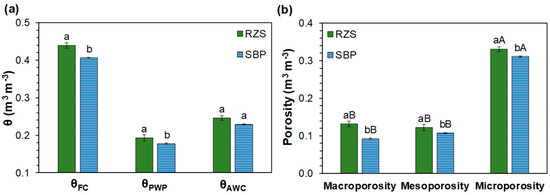 The highest θ for almost all Ψm in the RZS (Figure 2) resulted in higher (p < 0.05) θFC and θPWP in the RZS than in the SBP (Figure 3a). Therefore, θAWC did not show differences between treatments (Figure 3a), as the RZS and the SBP did not show differences in θ in SWRC between Ψm −4.0 to −33.0 kPa (Figure 2). These results do not accurately reflect the actual θAWC to the plants, as a study comparing SWRC from disturbed and undisturbed soil samples in an area very close to the study area demonstrated that for Ψm less negative than −10 kPa, disturbed soil had a higher θ than undisturbed soil [73]. Therefore, advances in technologies are required to provide in situ studies to best estimate the true difference between θAWC in the rhizosphere and bulk soil.