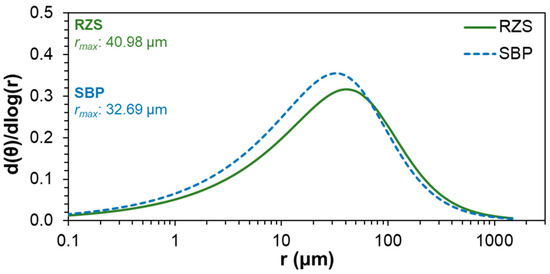 The value of the most frequent equivalent radius (rmax) for both RZS and SBP were in the mesopore class, with a higher size in the RZS (40.98 µm) than in the SBP (32.69 µm) (Figure 4). The class with a higher number of pores was the micropore class for both RZS and SBP (Figure 3b). RZS had a higher (p < 0.05) porosity (0.584 ± 0.006 m3 m−3) than SPB (0.510 ± 0.006 m3 m−3), with higher porosity in all the classes (Figure 3b).