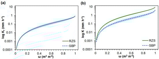 As no differences were found for parameter m obtained from Equation (2) (Table 2), Kr(ω) curves did not reveal any significant differences between RZS and SBP (Figure 5a). On the other hand, K(ω) showed higher values for RZS than for SBP (Figure 5b), thereby providing insight into the actual hydraulic conductivity conditions observed in these environments to incorporate the Ksat values. As measuring unsaturated hydraulic conductivity is difficult, Kr(ω) and K(ω) curves derive this function from the water retention characteristics and Ksat. Thus, the superior K(ω) values observed for RZS can be attributed to the better aggregation and porosity observed for RZS compared to SBP, as evidenced by the lowest RDC value (Table 1) [78,79].