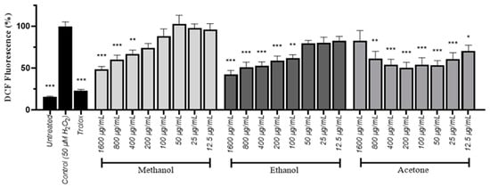 For further investigation of the antioxidant activity of S. officinalis root extracts, a 2’-7’-Dichlorodihydrofluorescein diacetate (DCFDA) assay was performed in human neuroblastoma (SH-SY5Y) cells to assess the ability of the extracts to reduce free radicals’ levels in cells treated with hydrogen peroxide. The methanol and ethanol extracts were most efficient at higher concentrations, while their antioxidant ability faded in lower concentrations. Conversely, the acetone extract demonstrated its maximum antioxidant capacity within the 50–400 μg/mL range, thus diminishing at lower and higher doses (Figure 1). The results were comparable to the DPPH assay, as shown by the IC50 values. The IC50 in DCFDA corresponds to the concentration of extract required to decrease by 50% the presence of radical oxygen species (ROS) in cells. The acetone extract was the most prominent, since it presented the lowest IC50 value, followed by the ethanol extract, while the methanol one exhibited a weak antioxidant capacity (Table 5).