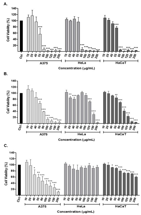 Cytotoxic effects of S. officinalis root extracts ((A) methanol, (B) ethanol, and (C) acetone extract) on A375, HeLa, and HaCaT cell lines. A375: human malignant melanoma; HeLa: human cervical epithelioid carcinoma; HaCaT: human keratinocyte. Cells were treated with or without extracts in different concentrations (0–200 μg/mL) for 72 h and evaluated by alamarBlue assay. All data are presented as mean values ± standard deviation and are representative of three independent experiments. p values * < 0.05, ** < 0.01, and *** < 0.001 compared to control.