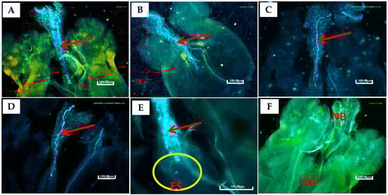 PGR- or RL-treated flowers, pollen germination, and ovule fertilization: (A) ovule of untreated female flower x pollen of RL-treated male flower; (B) ovule of RL-treated female flower x pollen of untreated male flower; (C) ovule of untreated female flower x pollen of PGR-treated male flower; (D) PGR-treated female flower x pollen from untreated male flower; (E) pollen penetration into embryo sac (ES) and fertilization; (F) ovule of untreated female flower x pollen of untreated male flower. NB—nucellar beak; NU—nucellus. Red arrows point at pollen tubes, and a yellow circle surrounds an embryo sac region within the nucellus. Scale bar = 100 μm.