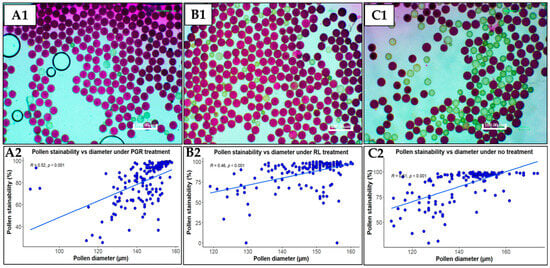 Pollen stainability and its correlation with diameter in flowers subjected to different treatments: (A) plant growth regulators (PGR) treatment; (B) red light (RL) treatment; (C) no treatment. (A1–C1) show pollen stained with Alexander staining and observed at 10× magnification using an inverted microscope and images taken with a camera head (Nikon DS-L3, Nikon Corporation, Tokyo, Japan). Pollen grains stained reddish purple are viable, while those stained pale green are unviable. Scale bar = 100 μm. (A2–C2) show correlations between stainability and diameter of pollen under PGR, RL and no treatments respectively.