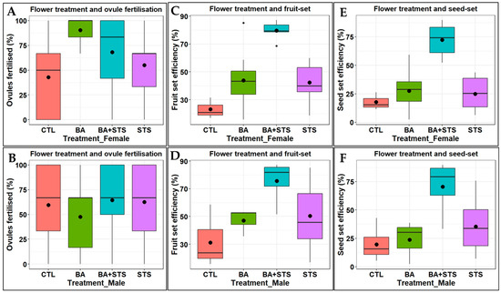 Mean efficiency of ovule fertilization and fruit and seed set in flowers subjected to PGR treatments: (A) ovules fertilized in treated female flowers; (B) ovules fertilized using pollen from treated flowers; (C,D) fruit set when female and male flowers were treated, respectively; (E,F) seed set when female and male flowers were treated, respectively. The black lines inside each boxplot represent the median value, and the dots inside each boxplot represent the mean value.