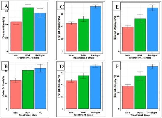 Comparison of effects of subjecting flowers to PGR and RL treatments on the efficiency of ovule fertilization and fruit and seed set: (A) ovules fertilized in treated female flowers; (B) ovules fertilized using pollen from treated male flowers; (C,D) fruit set when female and male flowers were treated, respectively; (E,F) seed set when female and male flowers were treated, respectively. Shown are means of replicates across flowering levels 1 to 4 and two growing seasons; 95% confidence intervals are indicated by standard error bars (ovules fertilised, n = 223; fruit set, n = 115; seed set, n = 115).