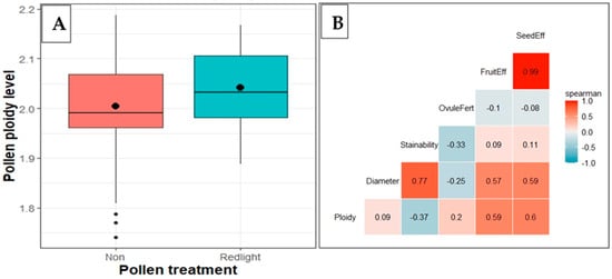 Cassava pollen ploidy and correlations: (A) effect of RL treatment on ploidy level (the dots inside each boxplot represent the mean value); (B) correlation between ploidy and pollen characteristics.