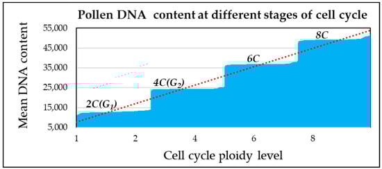Red light regulates developmental processes throughout plant life, including flower development [29,53]. The effect of RL on pollen ploidy has not been previously reported. However, in a previous study, extended photoperiod improved pollen quality in hexaploids better than in diploid and tetraploids and promoted the formation of apomictic seeds in the Ranunculus auricomus complex (Ranunculaceae) [54]. In this study, the pollen of flowers exposed to red light treatment exhibited a slightly increased ploidy level. Moreover, DNA content in the pollen grains of treated flowers ranged from a 2C (diploid) amount to polyploid amounts of 4C (tetraploid), 6C (hexaploidy), and 8C (octoploid), indicating an increased amount of cellular DNA, and the ploidy peaks stabilized slightly beyond the control channel mean of 200. This suggests that red light may have played a role in stimulating increased DNA amounts. The increase in the DNA content indicates cell somatic polyploidization, which could be attributed to either endomitosis or endoreduplication. Endoreduplication, a more common mode of cell polyploidization in plants, involves one or several rounds of nuclear DNA synthesis in the absence of mitosis [55,56]. It occurs during biological processes, including cell metabolism, differentiation, and cell expansion. Endoduplication is presumably important for increasing the availability of DNA templates for gene expression [57].